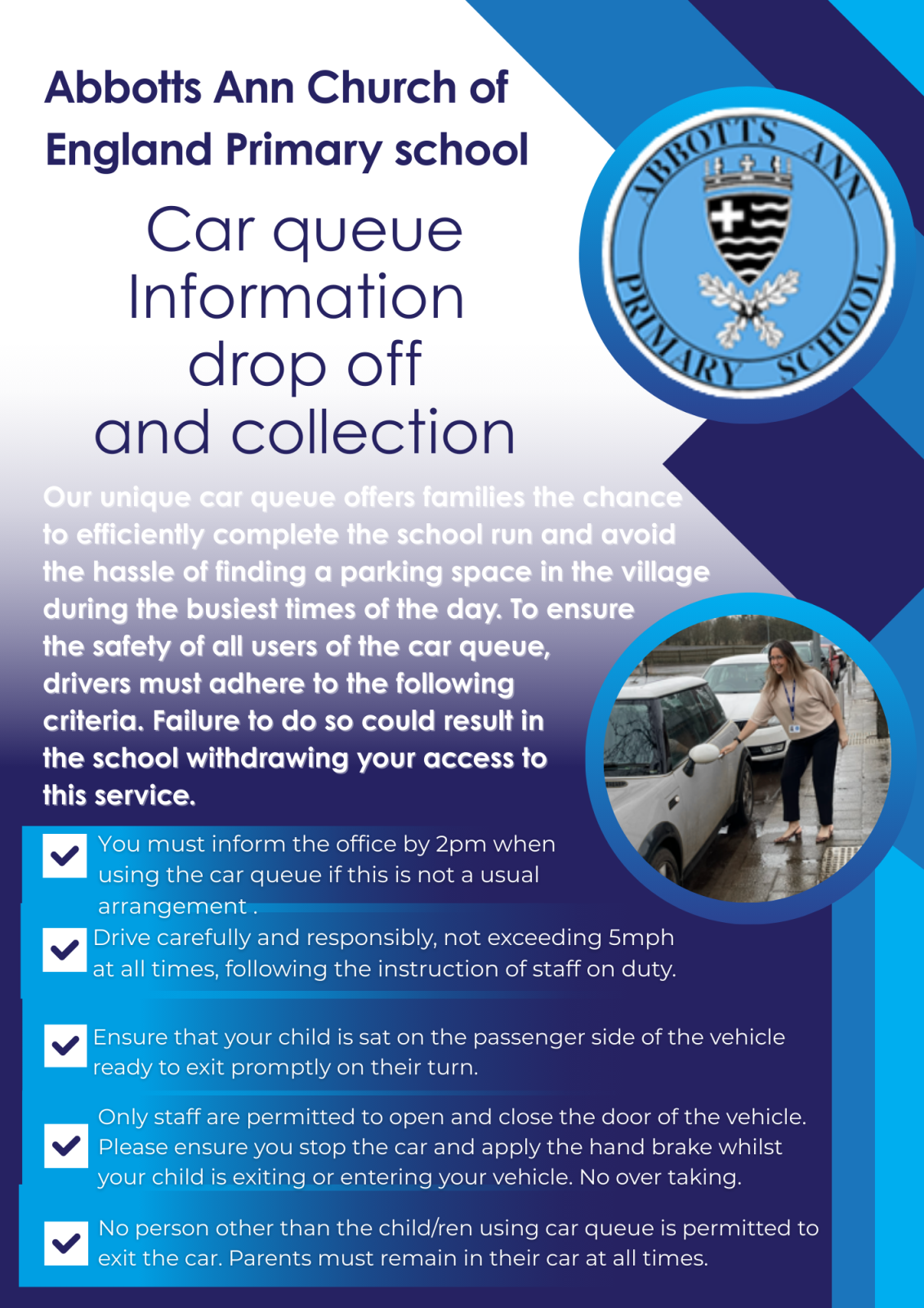 At Abbotts Ann CE Primary, we have a very unique offer for our school run, drop off and collection. We provide an onsite car queue where parents can drive into the car queue and staff will assist the children from their vehicle into school. This is to support the traffic in the village and lighten the load of parking traffic in our residential village. The car queue is organised and managed by the school. Car queue is compliant to health and safety laws through regular risk assessment reviews which are overseen by the local authority.